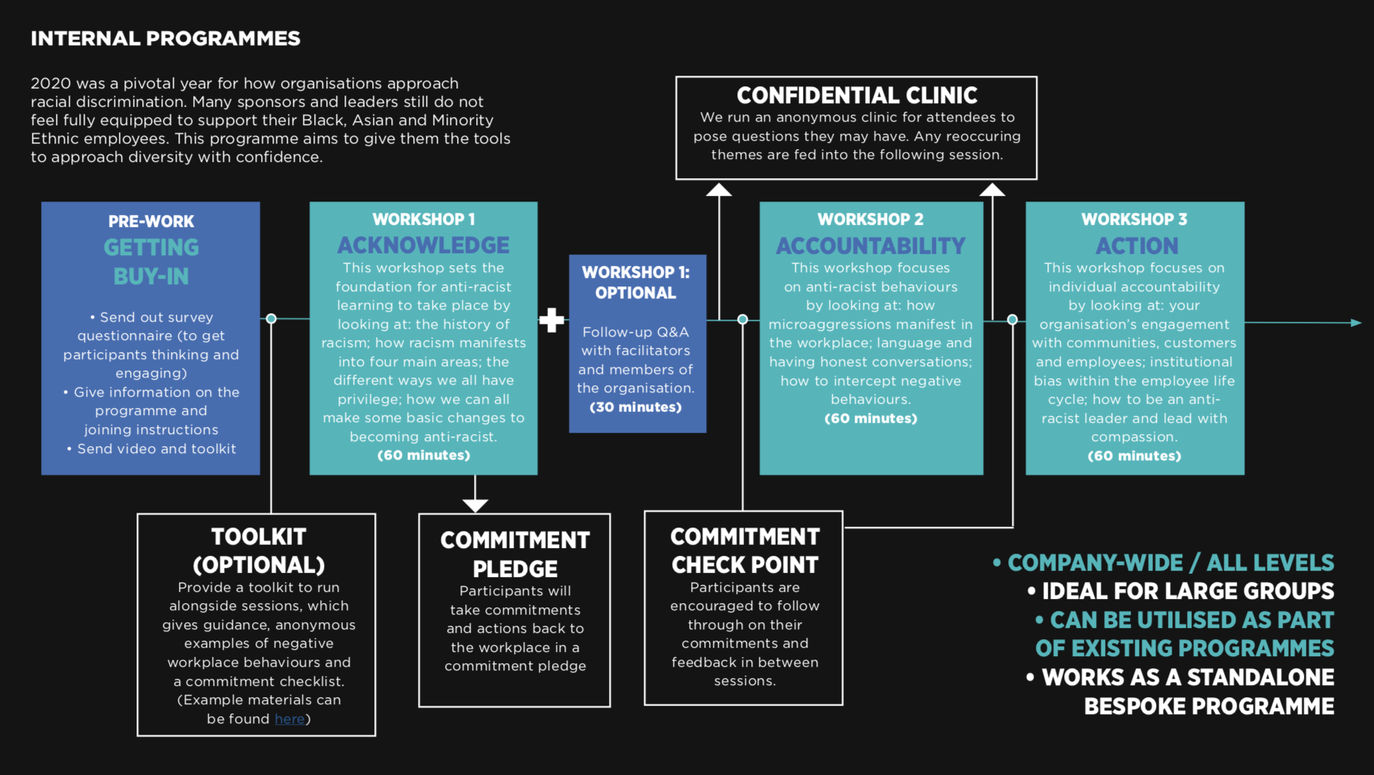 The diagram shows an example of our vitural sessions aimed at the entire organisation. We recommend that organisations continue the journey by providing a safe space for participants to share and support. Please download the pack to find out about our Board and line-manager programmes.